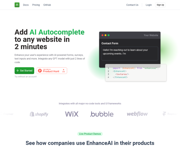 By harnessing the capabilities of GPT-powered AI technology, EnhanceAI seamlessly integrates with your website’s interactive elements. When a user starts typing in a form, survey, or text input field, our advanced algorithm predicts and suggests the completion of entries, basing its suggestions on context and user intent. This intuitive feature decreases the time spent on filling out information, minimizes errors, and elevates the overall efficiency of data input. Our plug-and-play solution is easy to integrate and works wonders in optimizing the user experience on any digital platform.