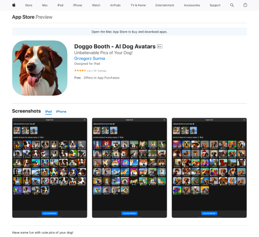 Unlock the magic of personalized canine companions with Doggo Booth, the innovative app at the forefront of AI-powered entertainment. Designed for pet enthusiasts and tech aficionados alike, Doggo Booth taps into cutting-edge artificial intelligence to create customized, lifelike dog avatars that capture the essence and charm of our furry friends. Whether you have a cherished pet or daydream about the perfect pup, this app offers a unique and heartwarming digital experience available on a variety of iOS devices including your iPhone, iPad, and iPod touch. Transform your admiration for dogs into custom avatars and share the joy with friends and family!