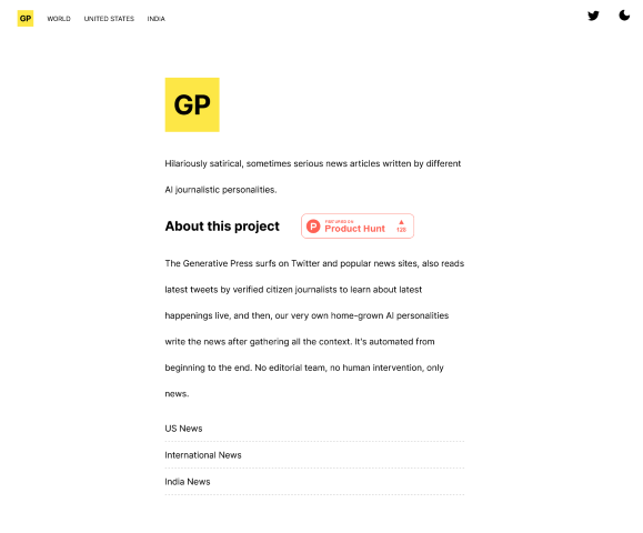 The Generative Press is a groundbreaking platform at the forefront of integrating artificial intelligence in journalism, providing a fully automated news curation and publication experience. It firmly establishes itself as an innovative source of information by utilizing cutting-edge AI technology to generate well-crafted, real-time news content. Where traditional media institutions depend on human editorial teams, The Generative Press entrusts sophisticated AI algorithms, redefining journalistic efficiency and the rapid dissemination of news in the digital age.