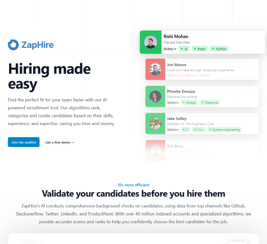 ZapHire operates as a sophisticated yet user-friendly AI recruitment assistant. Starting with a deep analysis of the job description, ZapHire extracts key skills and qualifications required for the role. By tapping into a rich database of candidate profiles, the platform applies advanced algorithms to match potential candidates based on experience, expertise, and other relevant factors. ZapHire’s intelligent filtering capability also works to remove any bias, thereby promoting diversity and inclusiveness in the workplace. Additionally, the AI-driven insights provide valuable feedback on the labor market trends, making the hiring process not just faster, but smarter.